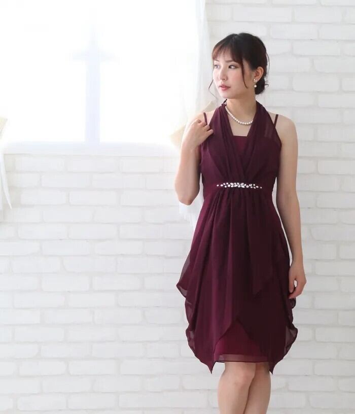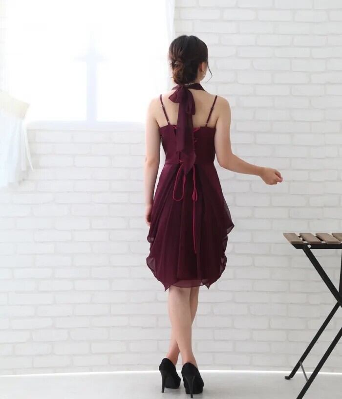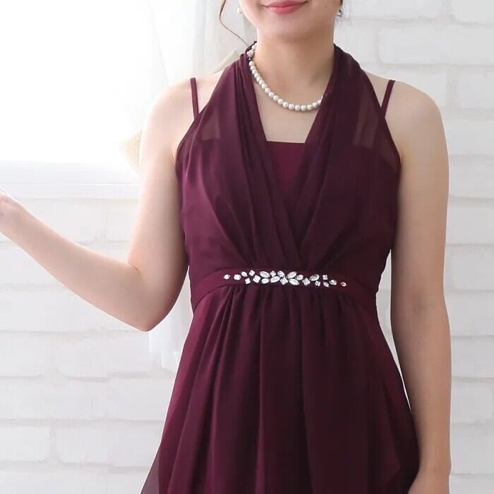 ホルターネックとふんわりコクーンシルエットのスカートが女性らしいデザインです。