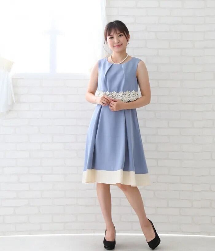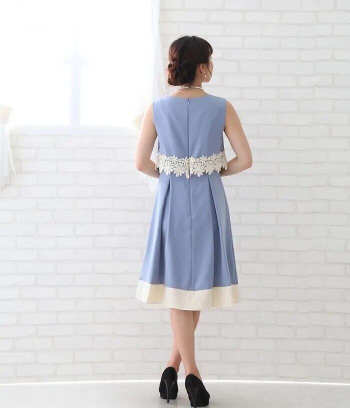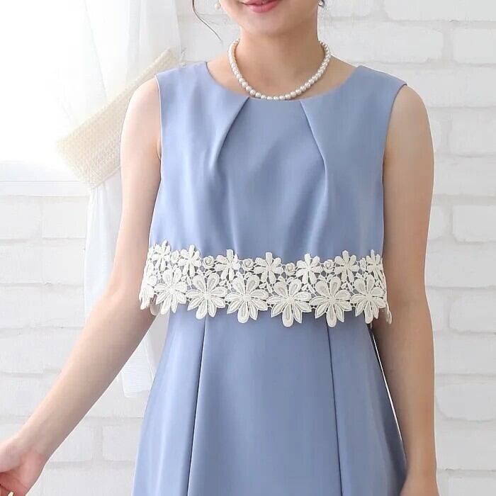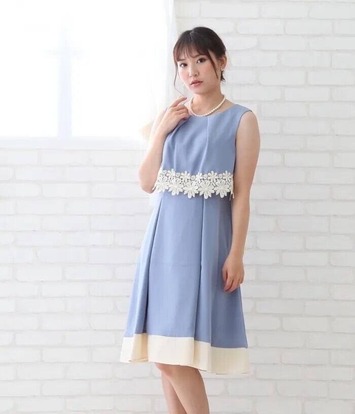 トップとスカートのセパレートのように見えるワンピースデザインでお花レースの切り替えがとってもキュート!
