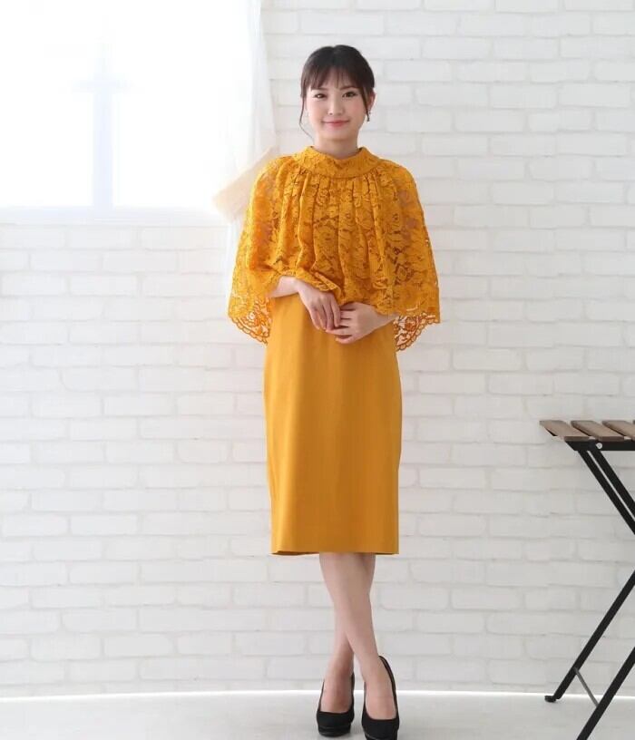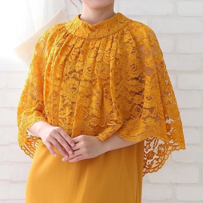 トップは総レースのケープ風デザイン。肘までしっかりと隠れる長さがあります。