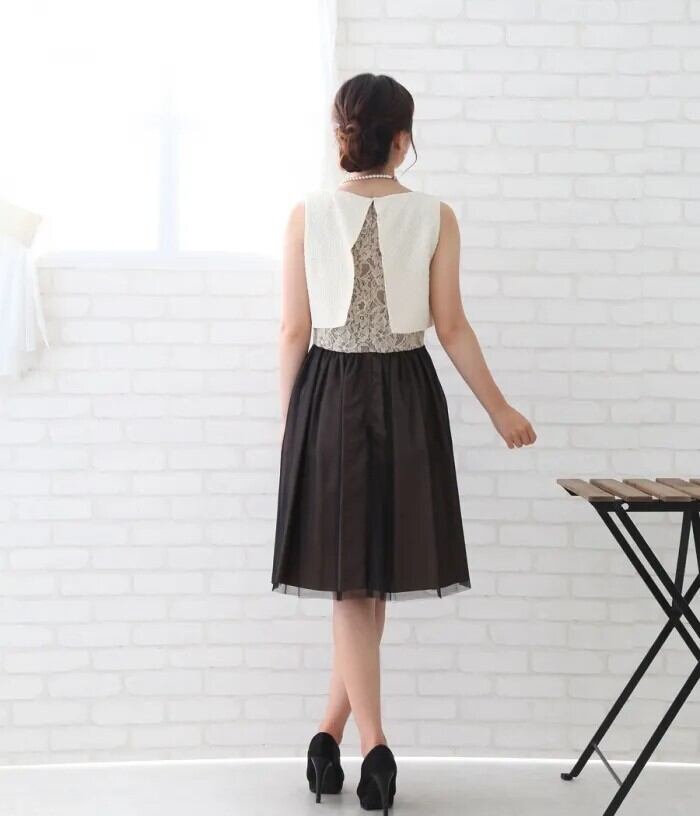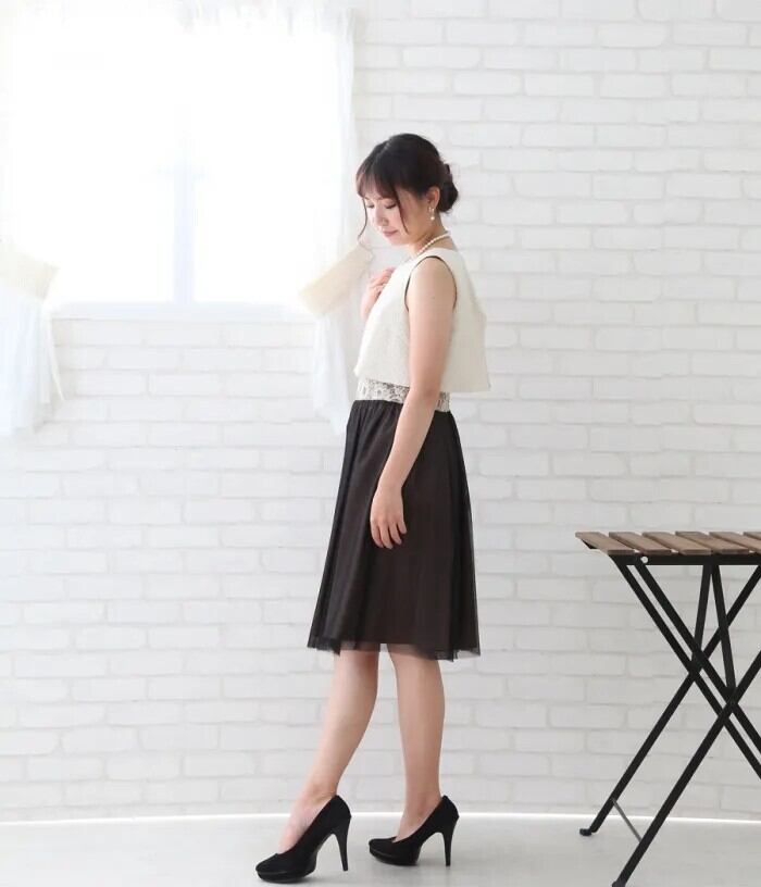 トップは凹凸のあるワッフル風、スカートはブラウンのサテンに黒のチュールレースを重ねています。