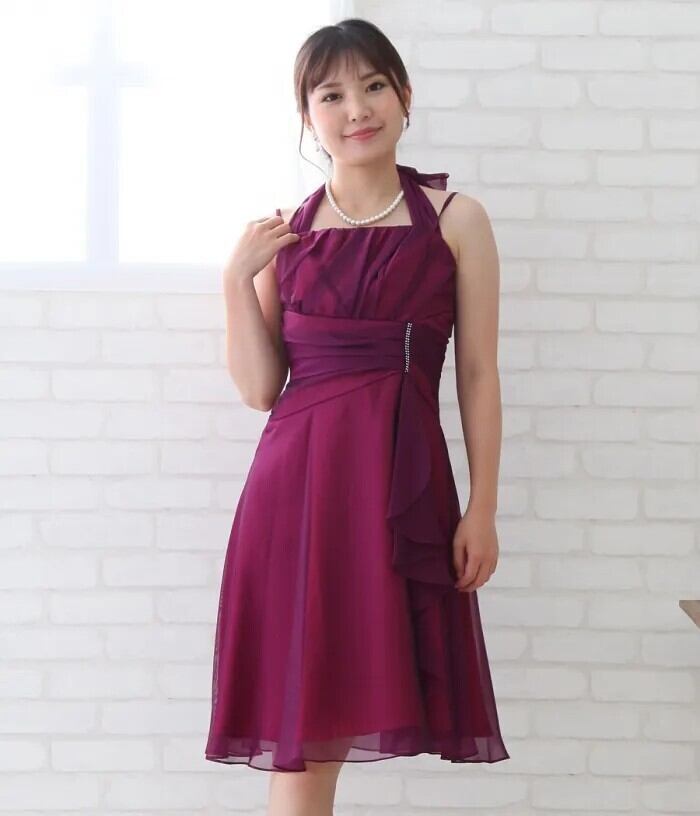 キャミドレスにホルターネックのリボンが付いてバックスタイルも華やかな印象です。