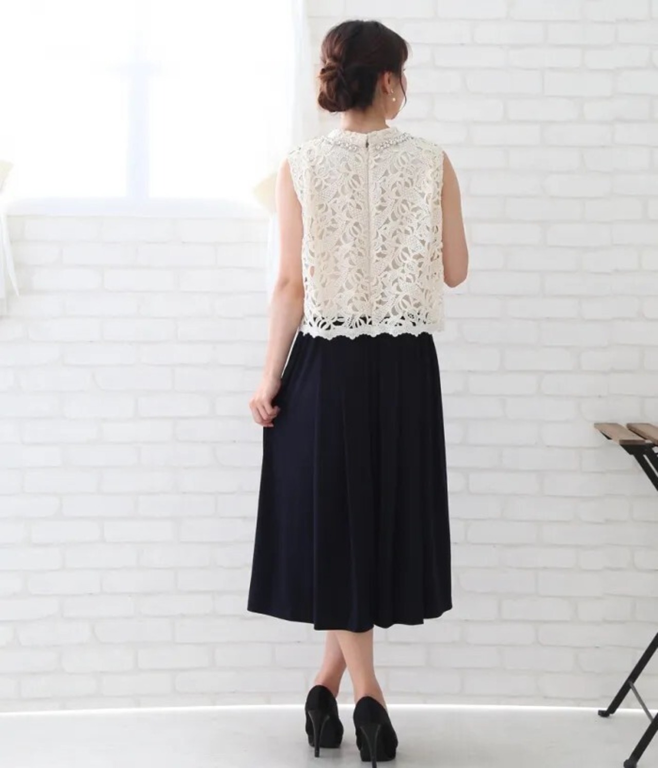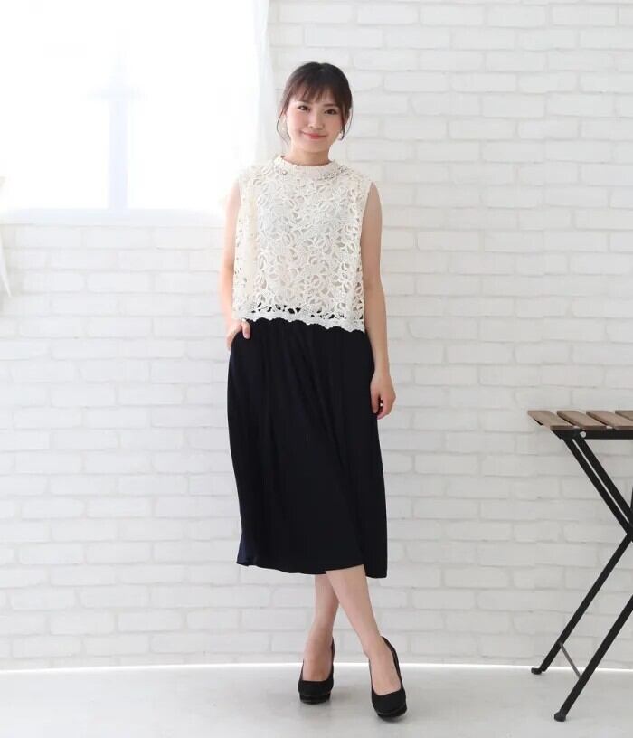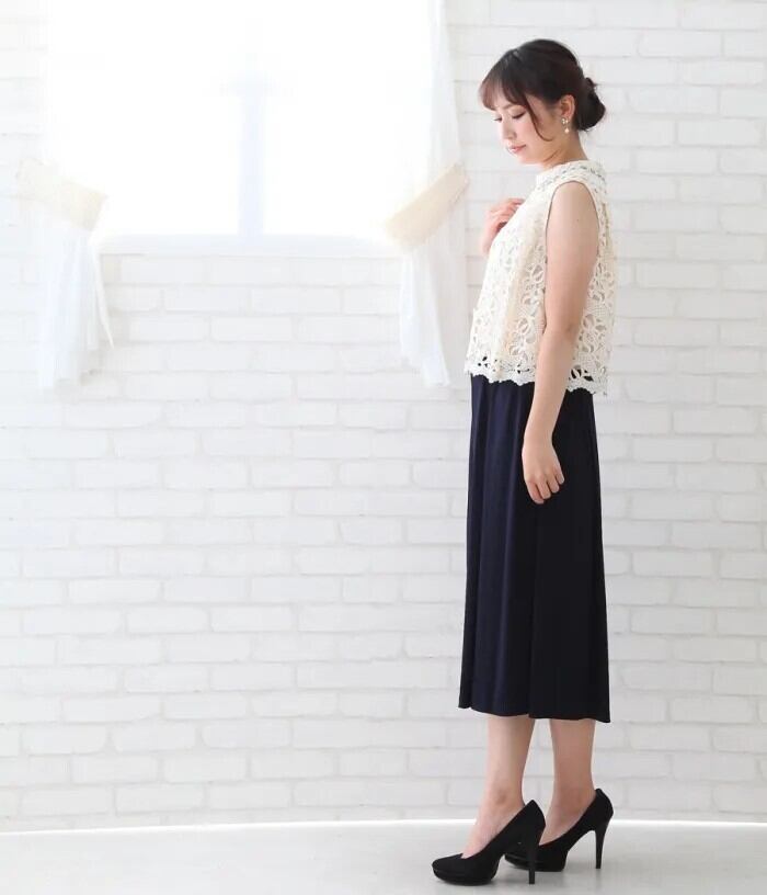 レースととろみ素材を組み合わせたドッキングデザインのパンツドレスです。