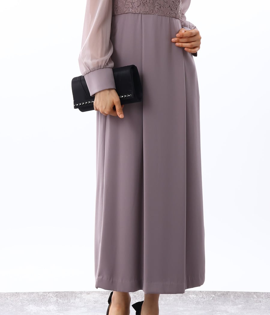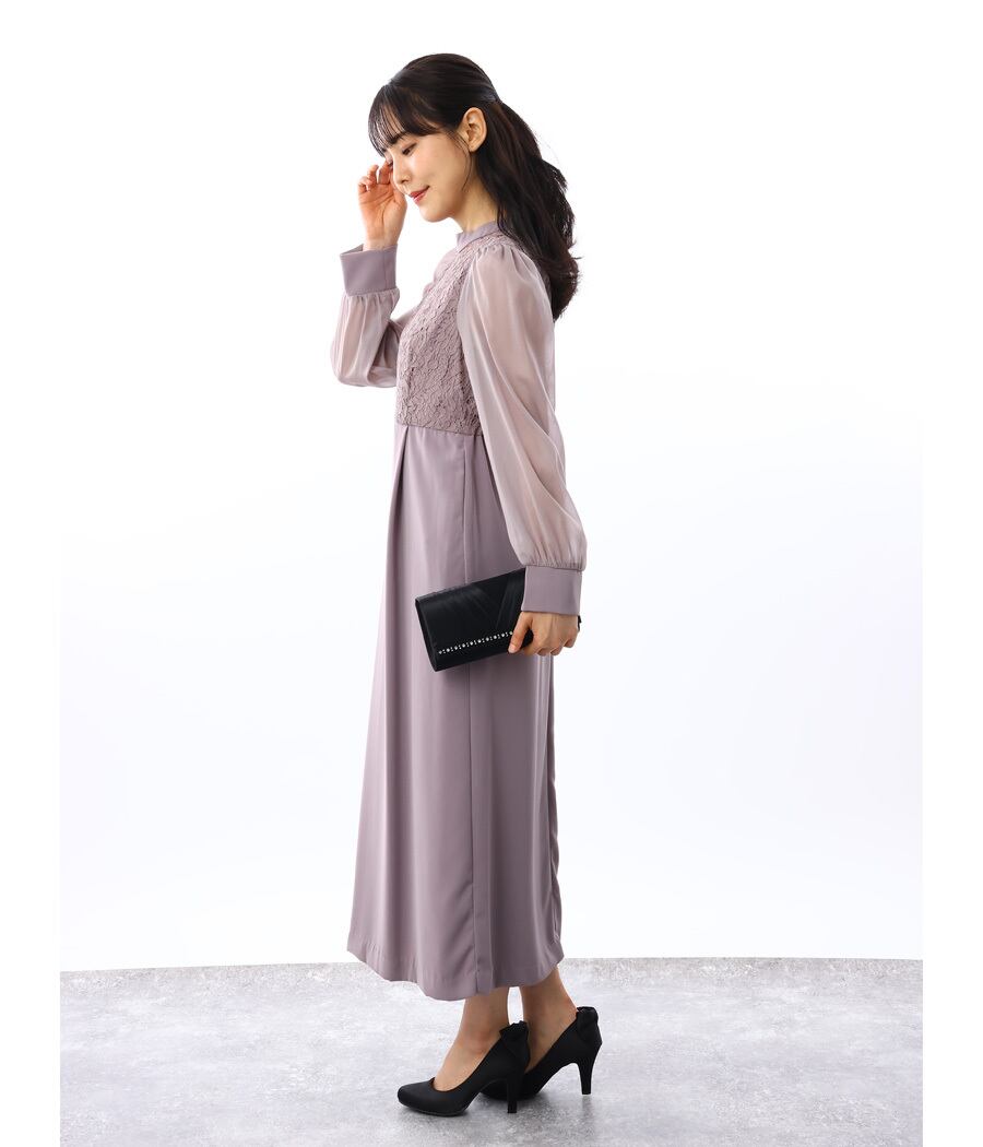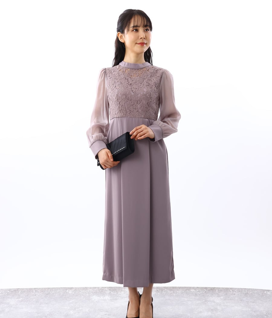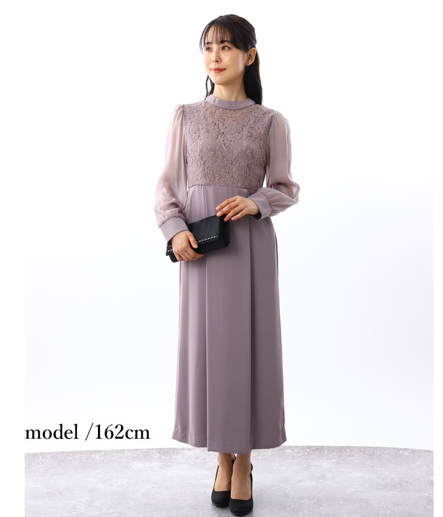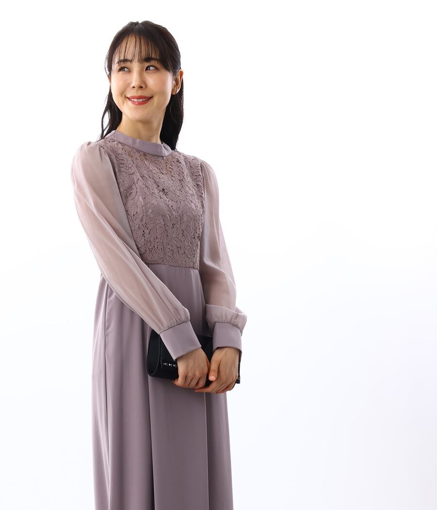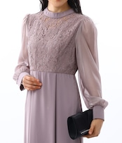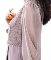 胸元にレース、スカートと首元には上品な輝きのサテン素材を使ったワンピースです。