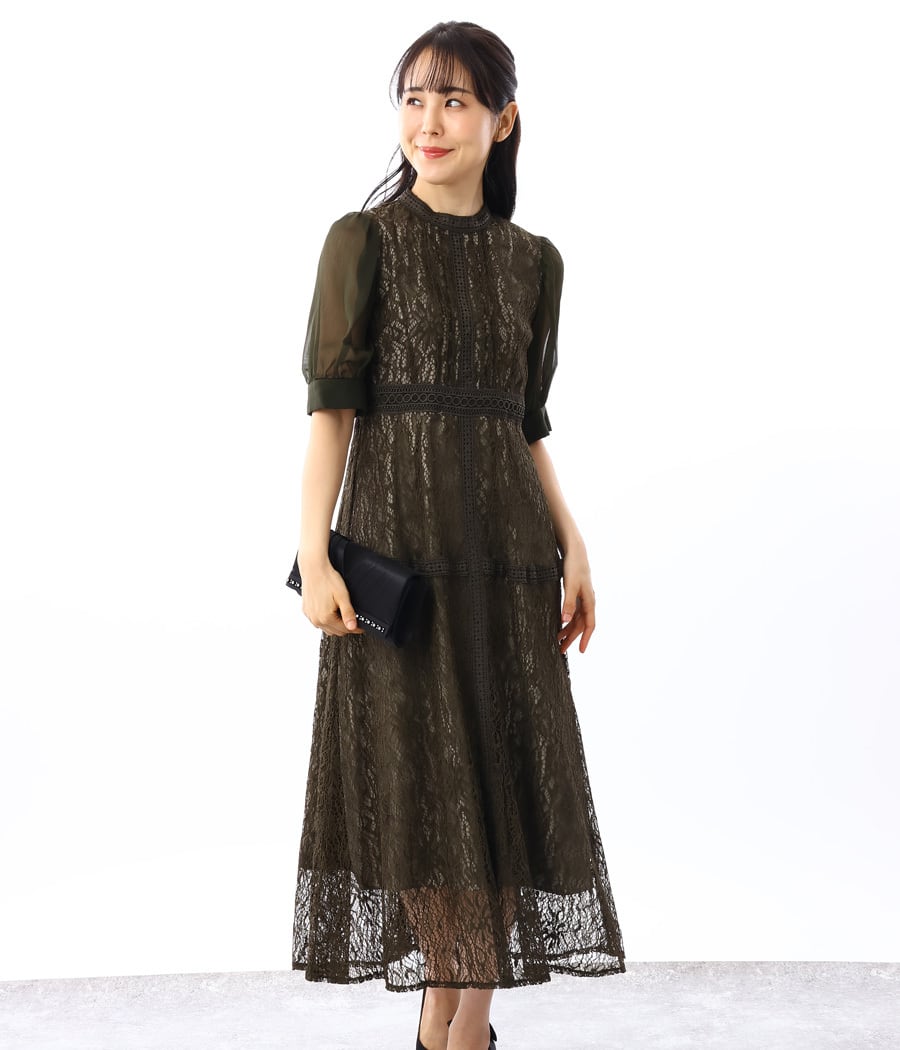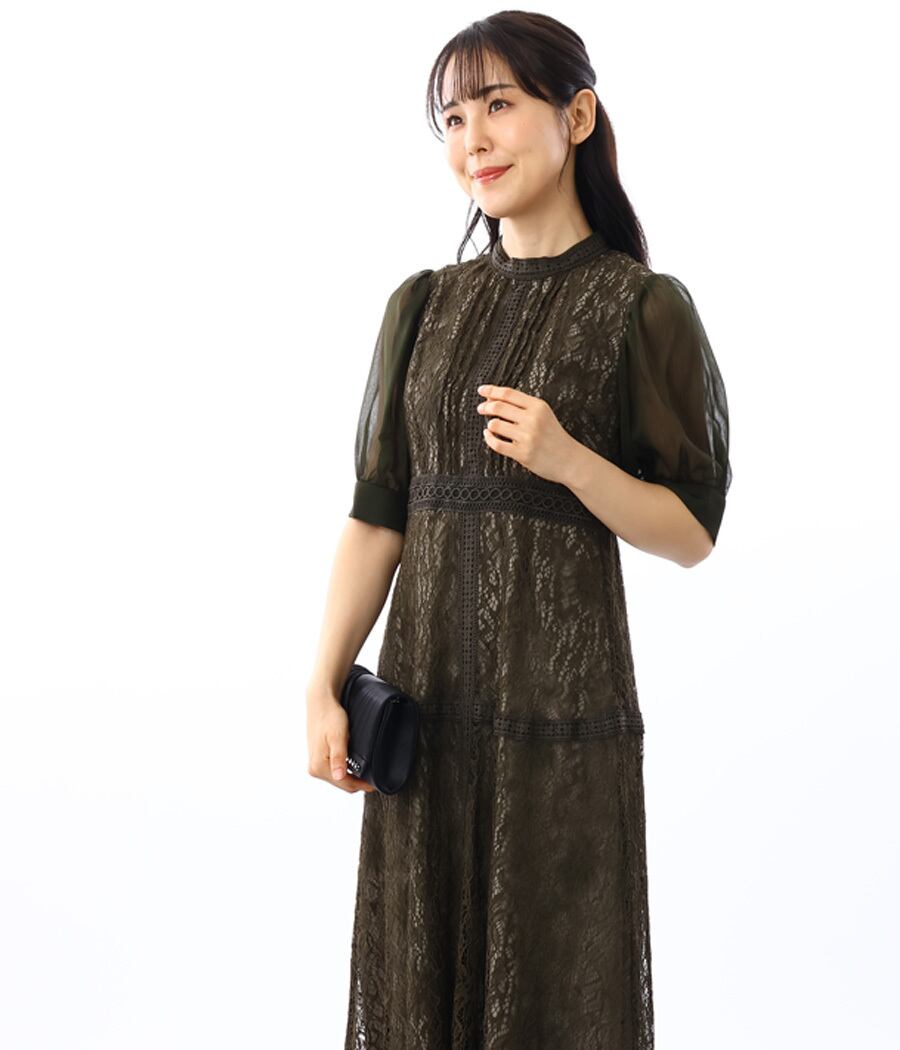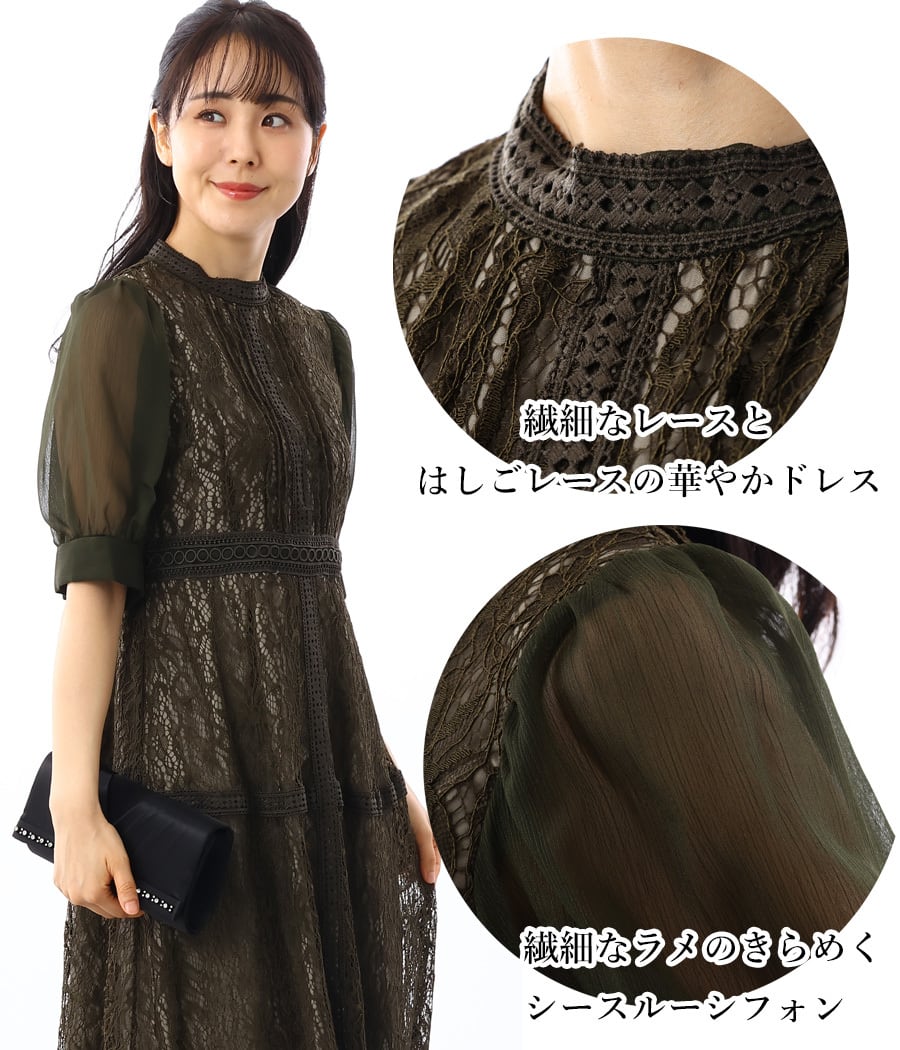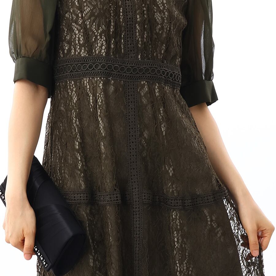 胸元やウエスト、スカートにもリボンレースをふんだんに使った、華やかな中にも品のあるワンピースです。