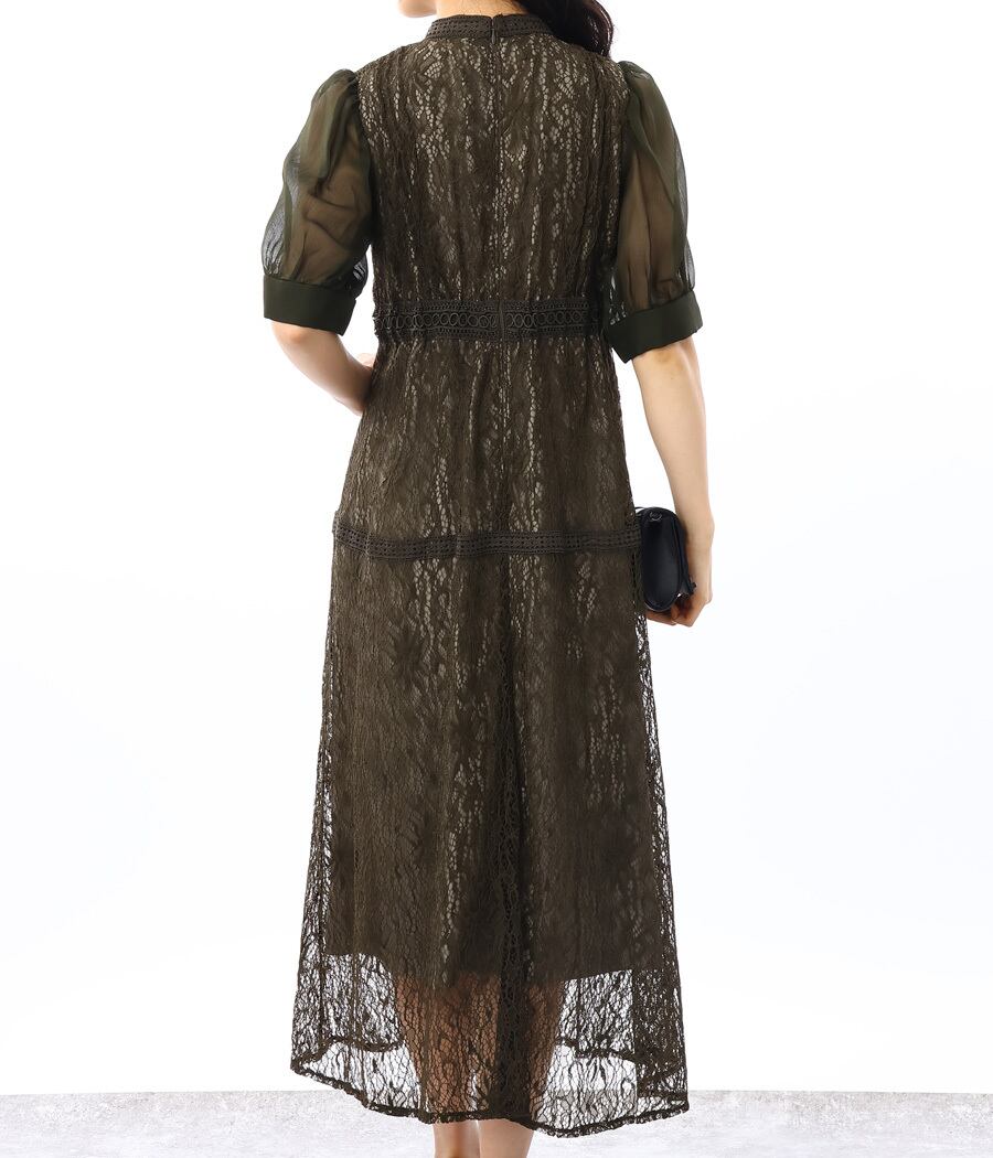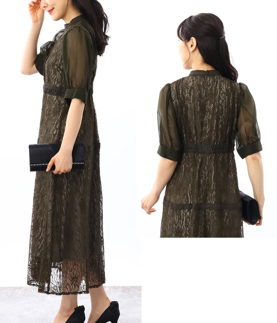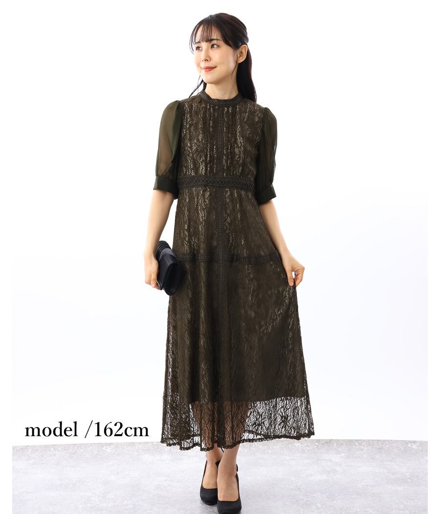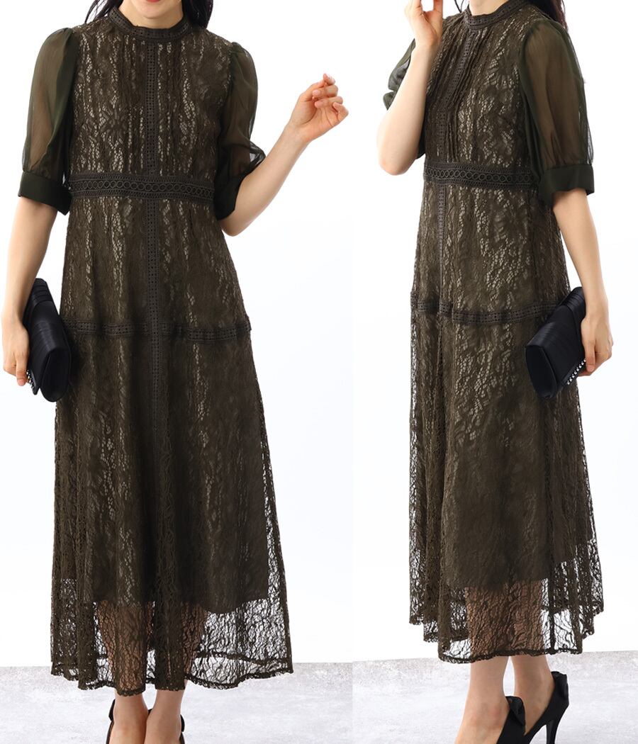 胸元やウエスト、スカートにもリボンレースをふんだんに使った、華やかな中にも品のあるワンピースです。