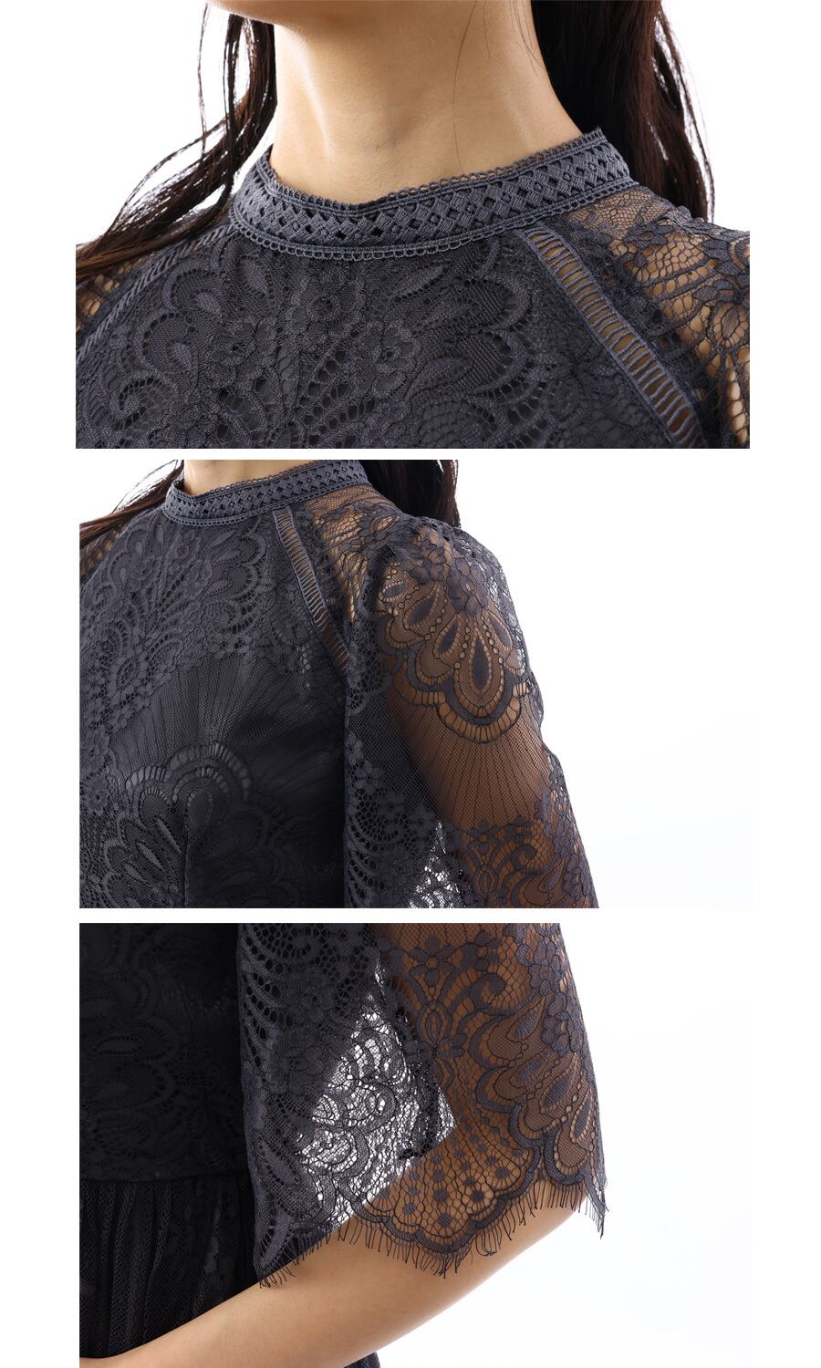 首元は少し高めで、レースの縁取りがポイントになって上品な印象です。