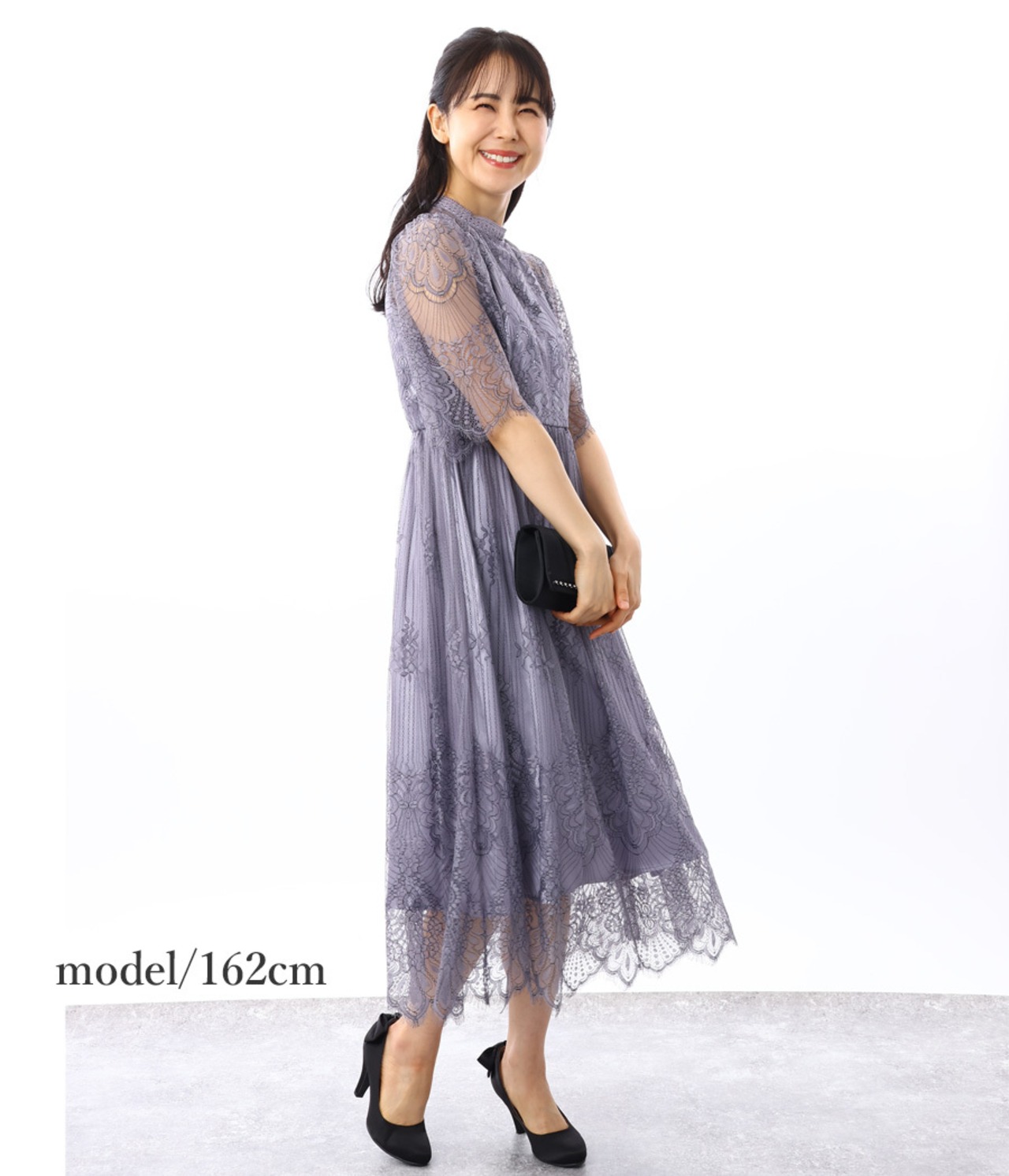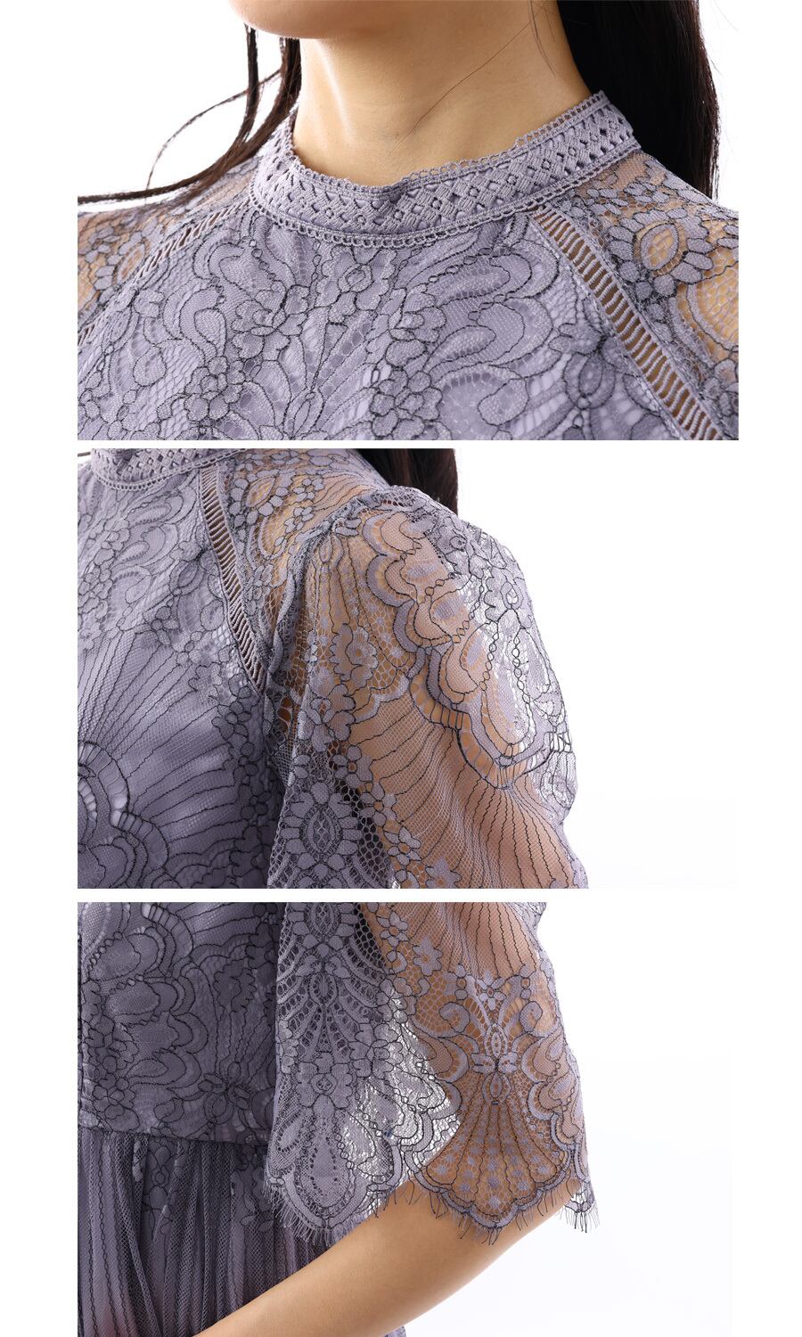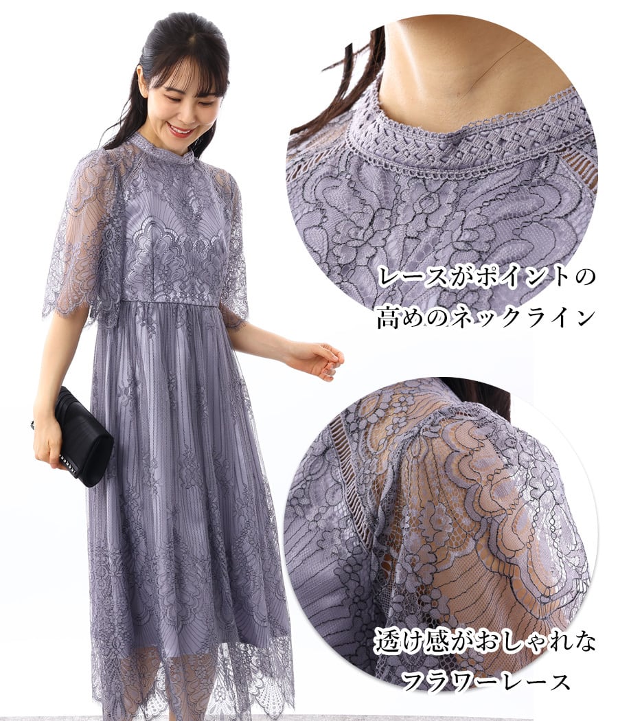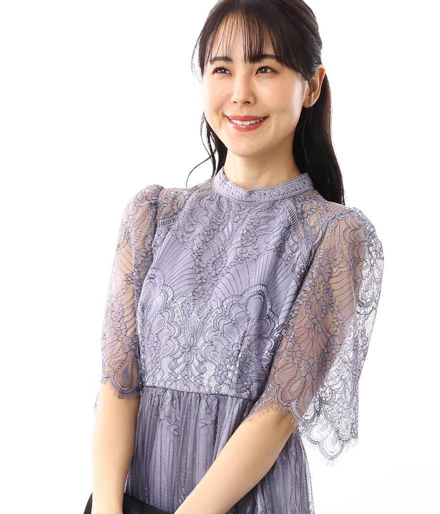 首元は少し高めで、レースの縁取りがポイントになって上品な印象です。