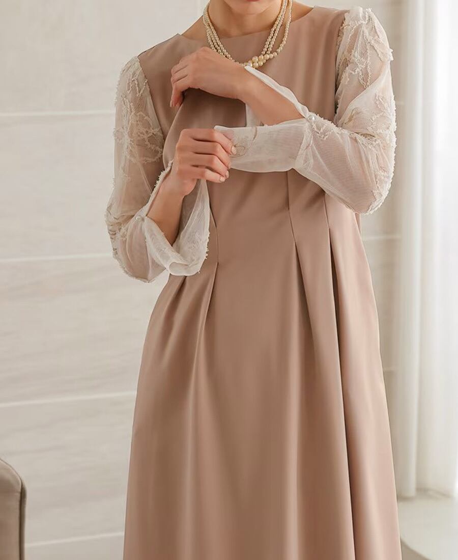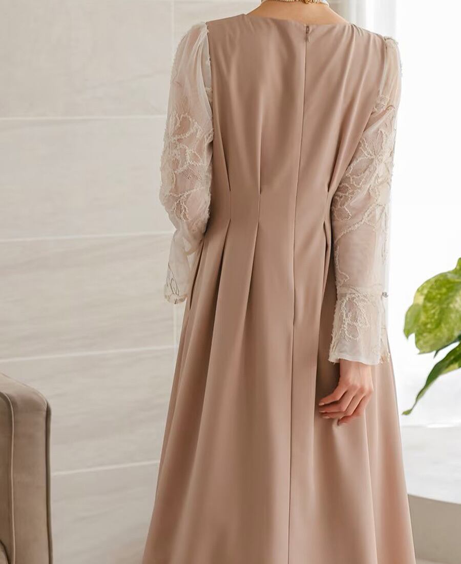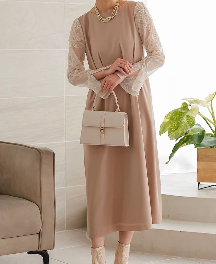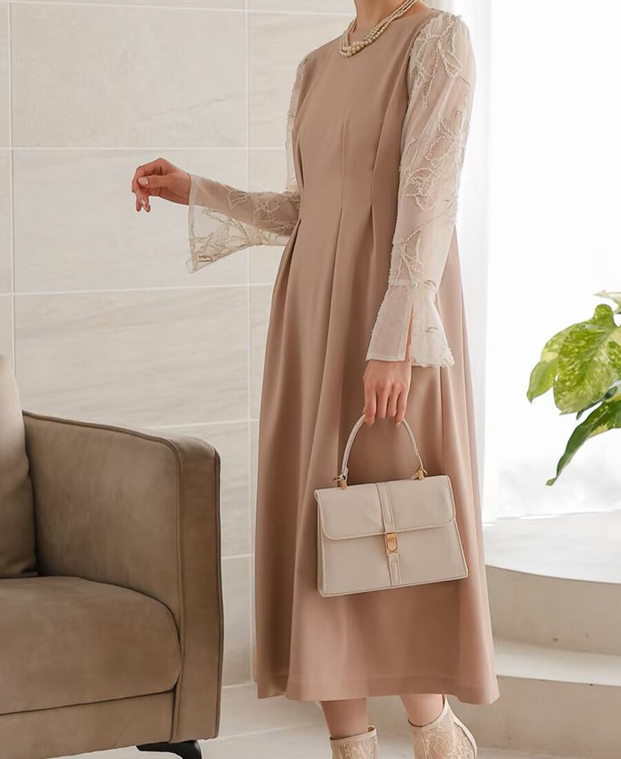 やさしいピンクベージュのカラーはご友人の結婚式、イベントパーティーなど華やかなシーンにぴったり
