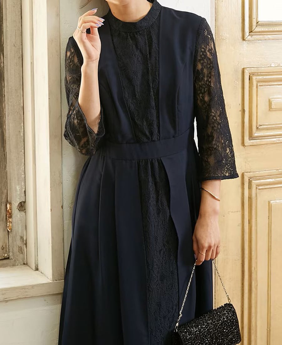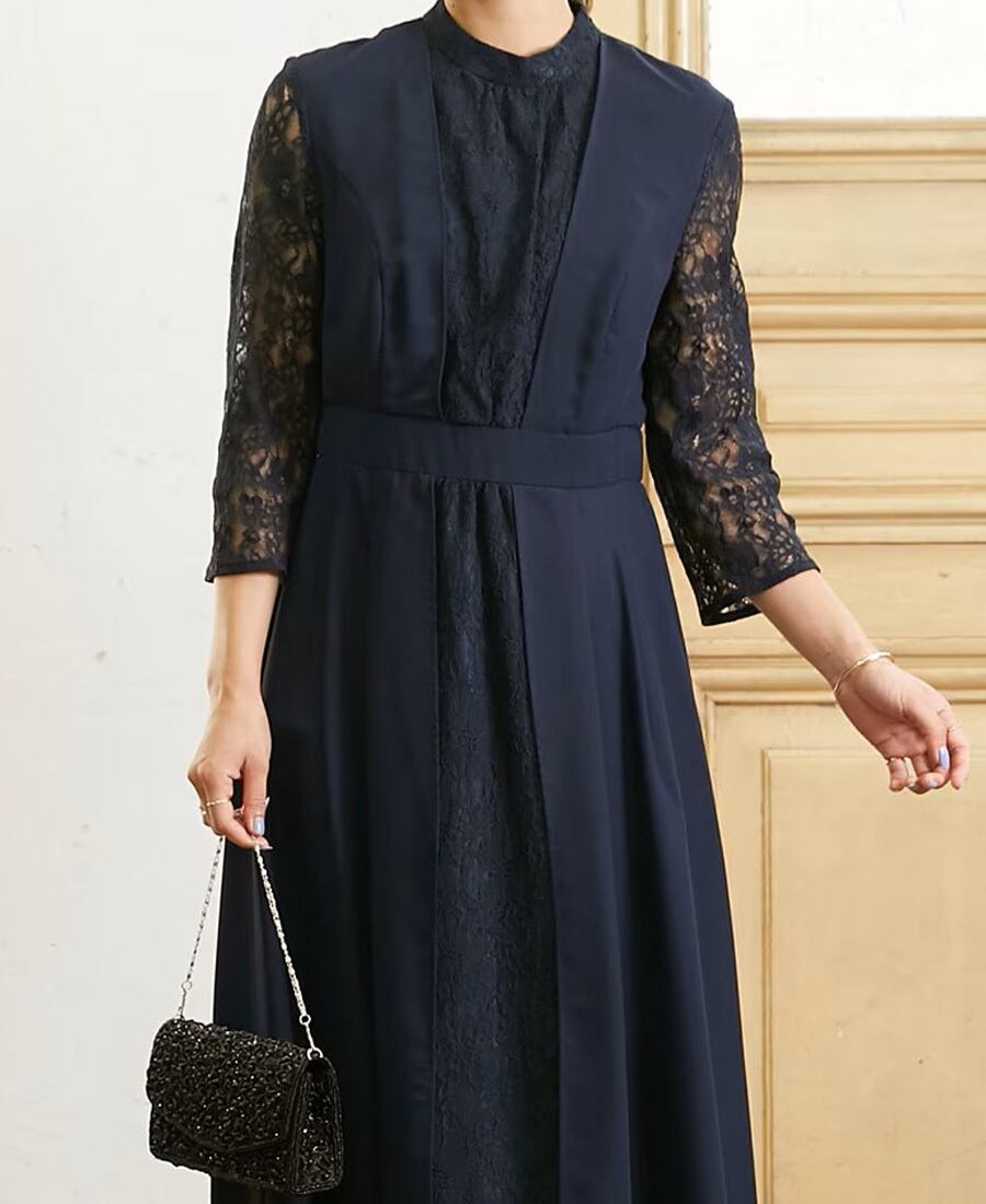 レースの切り替えがおしゃれなネイビーワンピース