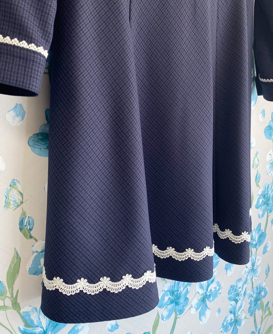 細かな千鳥格子の清楚なネイビーチェックでフォーマルなシーンにおすすめのワンピースです