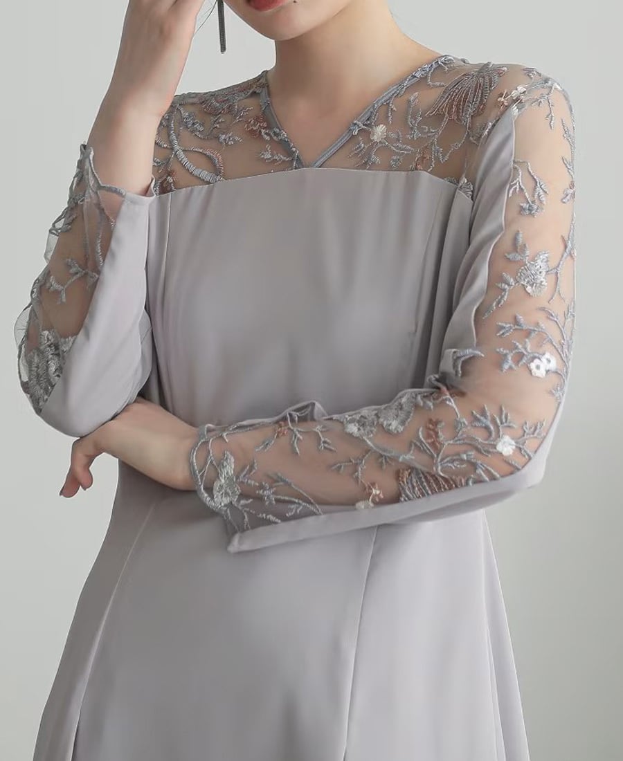 胸元や袖の透け感と美しいレースが印象的なドレス