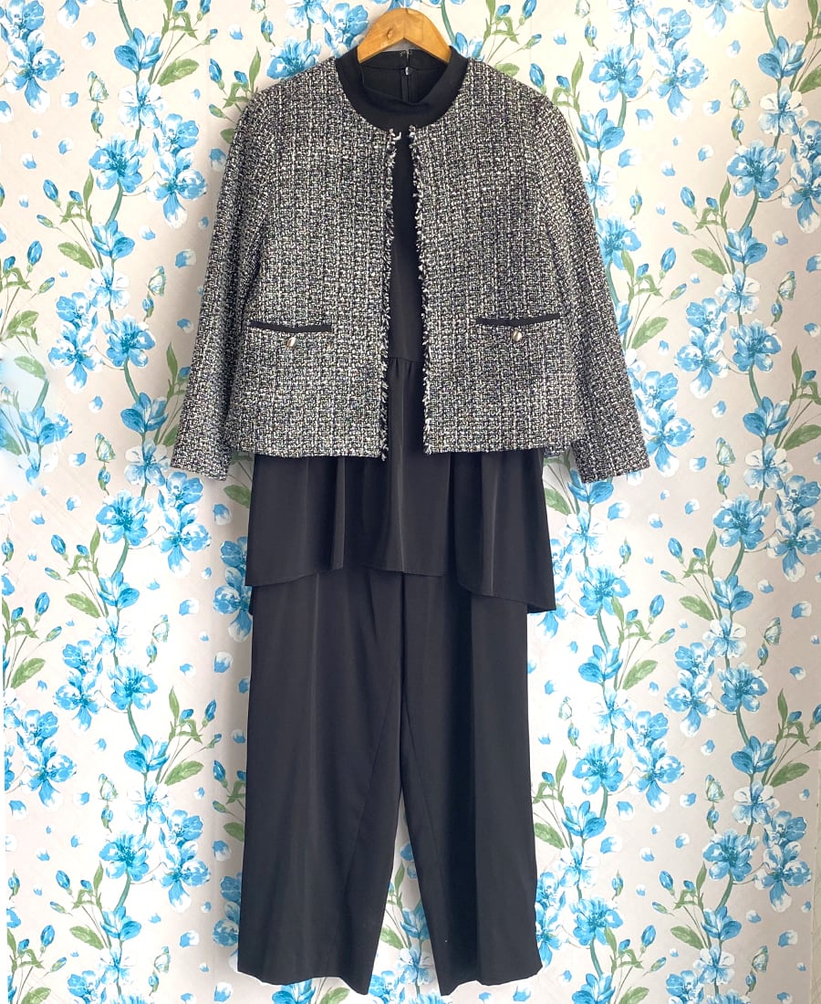ツイード素材のノーカラージャケットとブラウス・パンツの3点セット